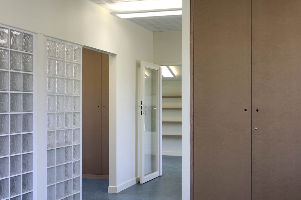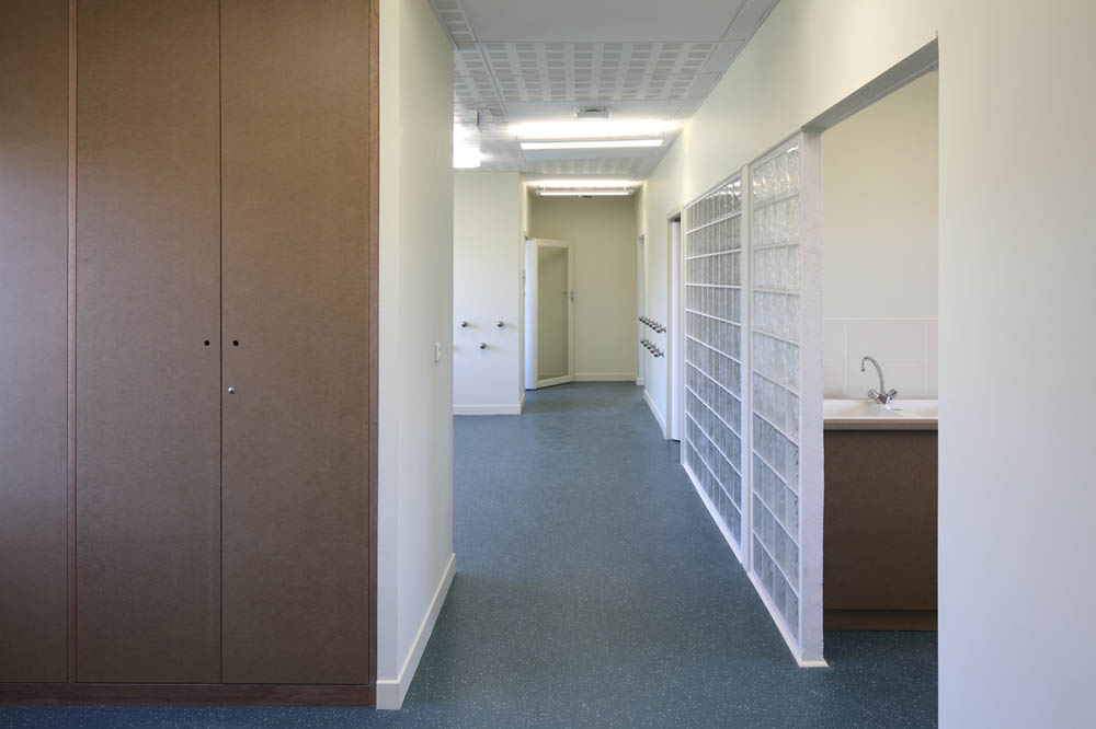 L’objectif est également de valoriser et de profiter de l’éclairage naturel traversant, la circulation est ménagée au centre, ouverte sur les espaces d’activités, et des parois en briques de verre lui apportent de la lumière au travers des pièces fermées.