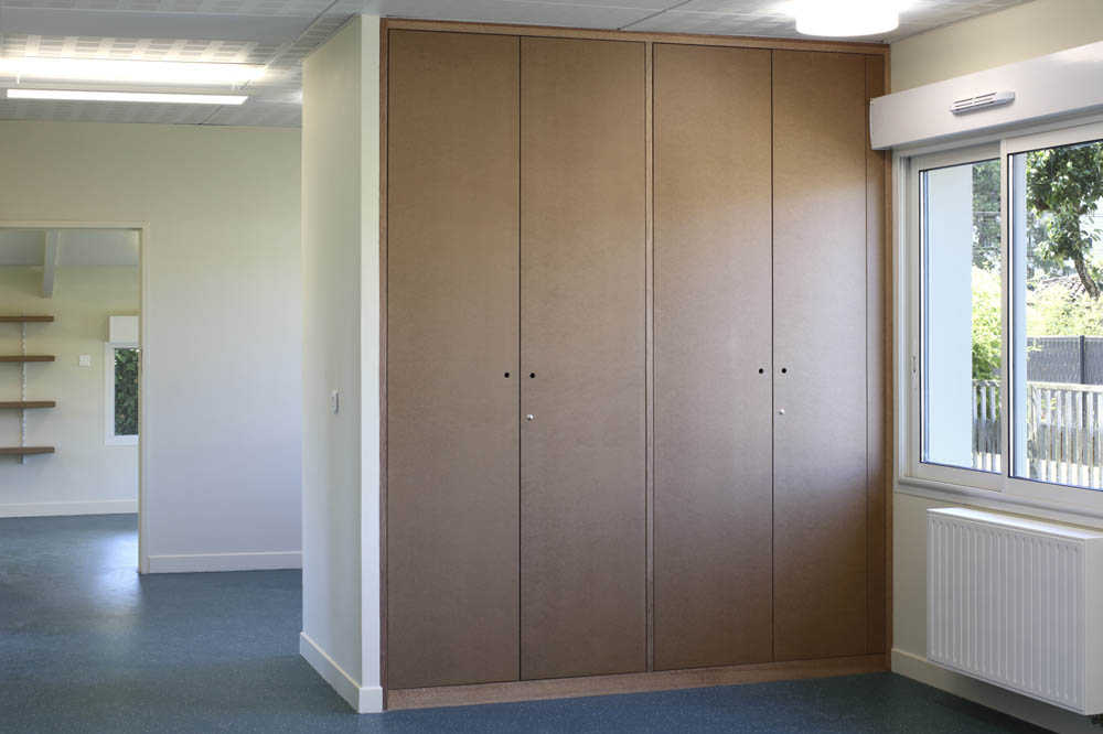 A l’extérieur, une rampe est aménagée depuis la cour de l’école, jusqu’au palier, l’auvent est remplacé et se prolonge en garde-corps au droit de l’entrée.