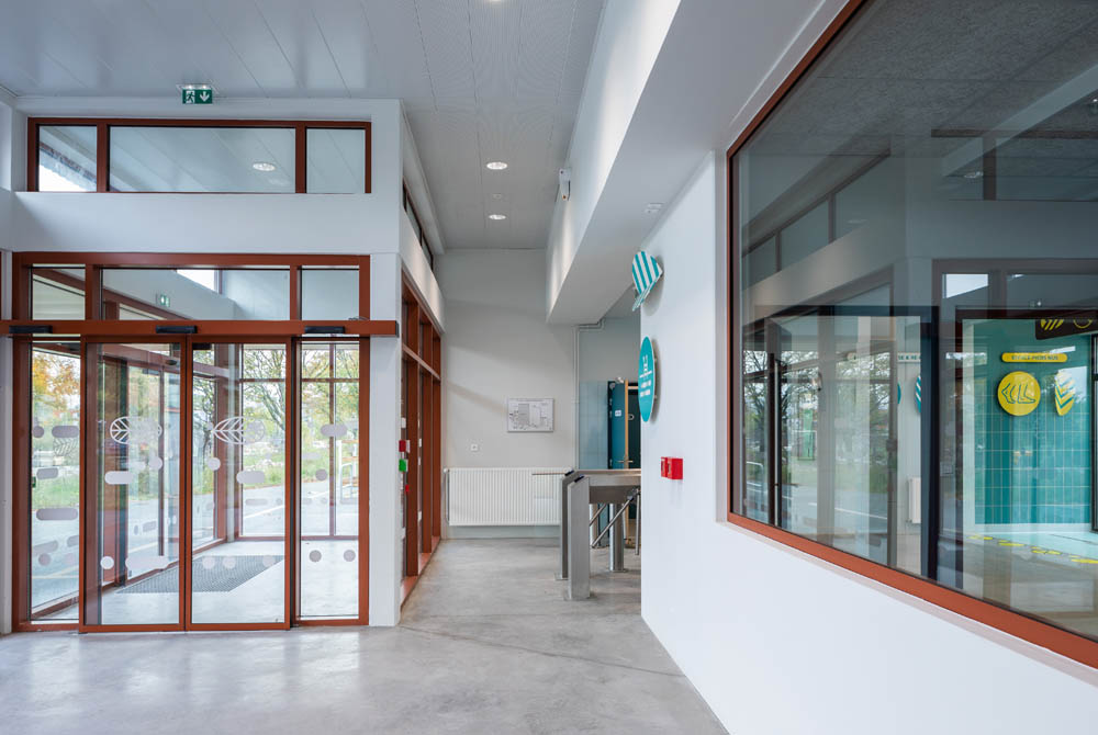 L’accueil et les vestiaires constituent un bâtiment neuf, qui cherche à retrouver la simplicité et la rationalité du bâtiment originel.