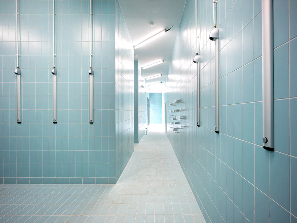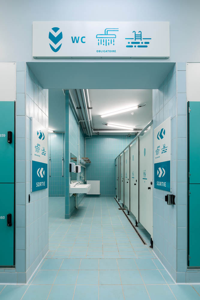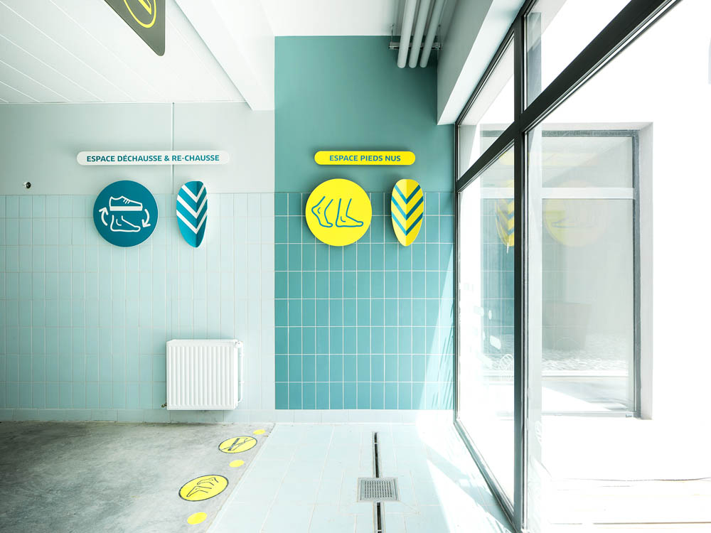 Dasn la halle bassin d’origine, les revêtements intérieurs muraux et en plafond ont pour enjeux d’homogénéiser l’ambiance colorée et visuelle, et d’en améliorer le confort acoustique : éclairage, panneaux acoustiques, sono… dans une palette de matériaux harmonieuse.