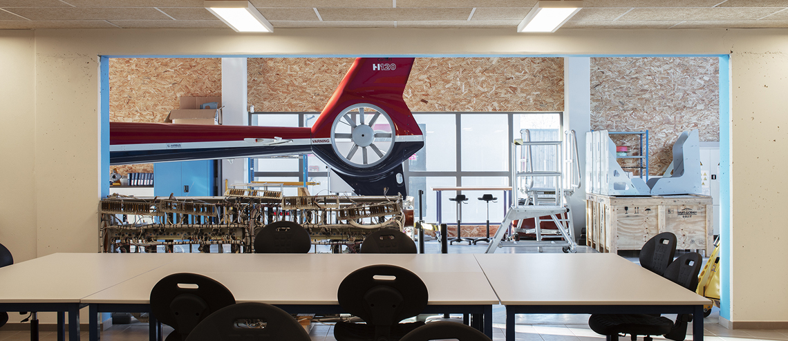 Ce volume unique s’ouvre et signale la halle comme une mise en scène technologique. Elle abrite le plateau technique, traversant du hall vers l’aire logistique. Autour de ce noyau pédagogique, les entités d’enseignements sont connectées comme le sont les disciplines composant l’avionique.