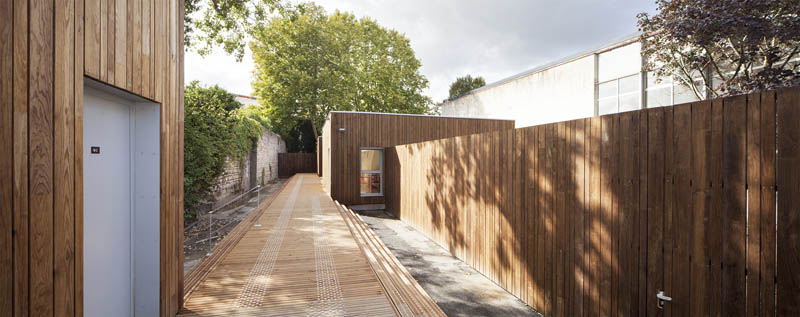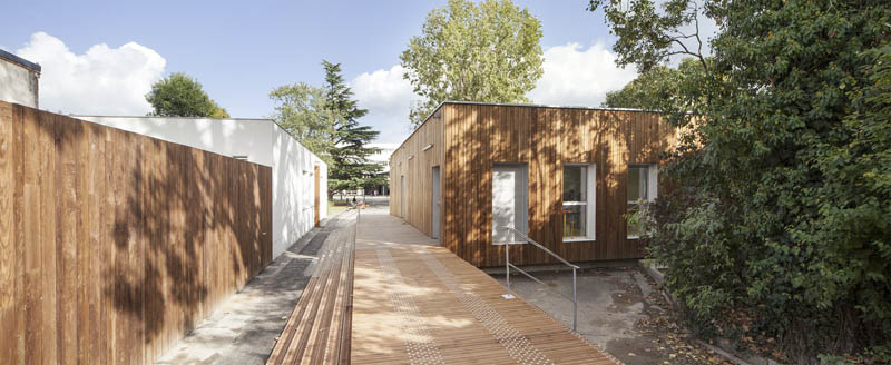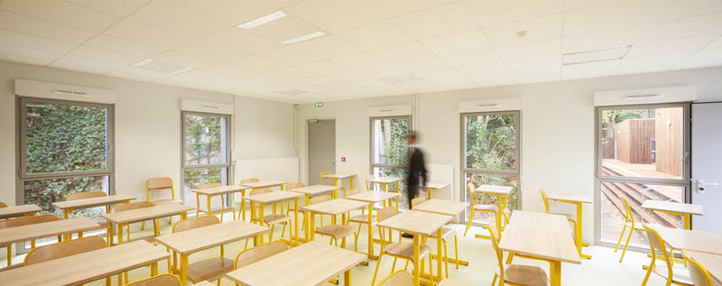 Le projet se compose de deux blocs reliés par une coursive et un auvent en bois. Cela permet de proposer des vues dégagées pour l’ensemble des salles de classes et d’avoir un impact contrôlé sur la végétation et les grands arbres existants ; cette composition permet également la possibilité d’extensions futures.
